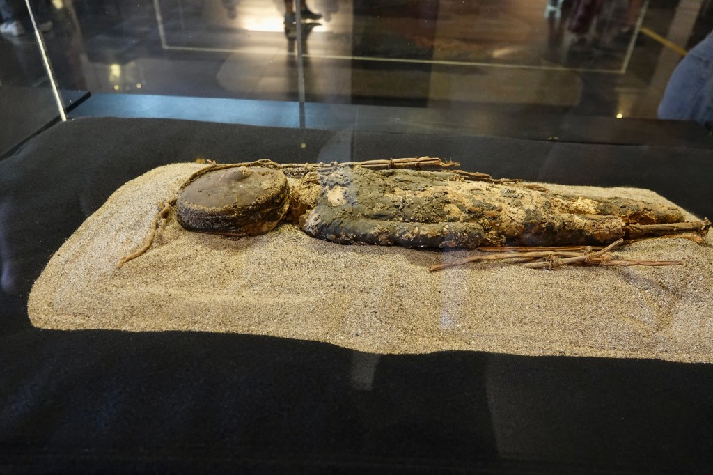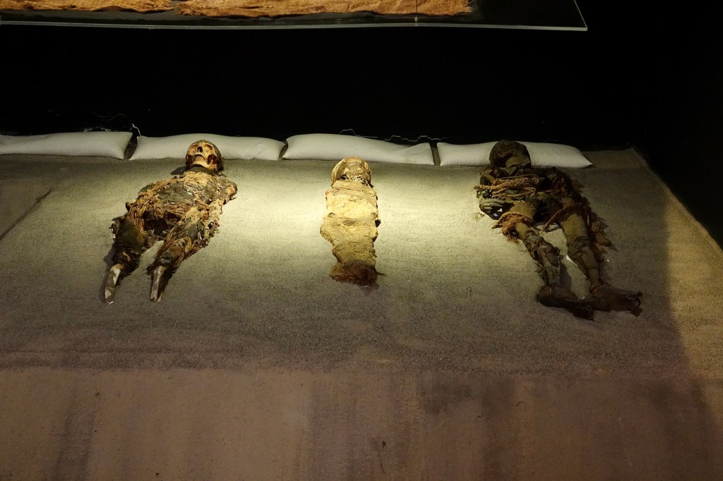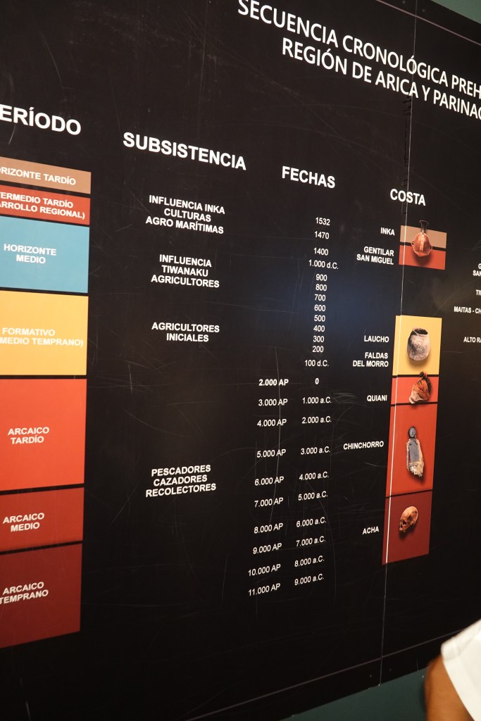 There are a couple of sights to see, one a small museum on the site of what was going to be a hotel until a total of 32 Chinchorro mummified bodies were discovered when excavating the foundations. They are as they were found underneath a glass floor and date from some 6000 years ago (I believe). Fascinating stuff…