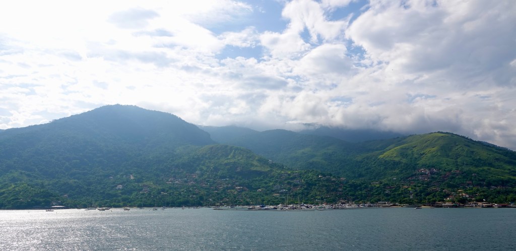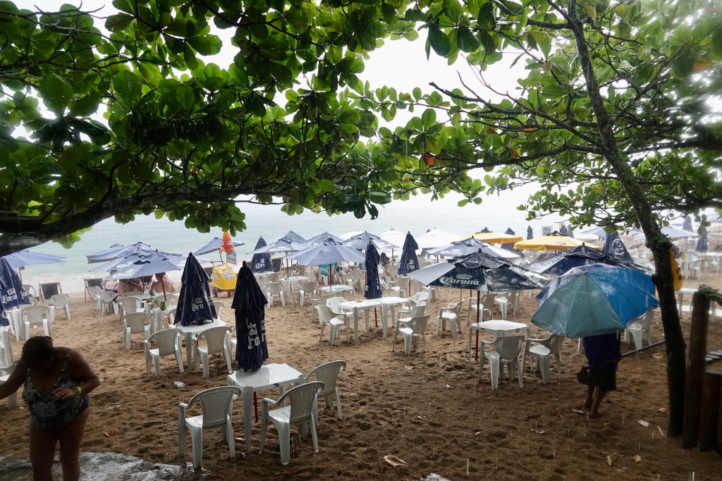 Our next port of call was the Brazilian holiday island of Ilhabela, which actually means ‘beautiful island’ in Portuguese. It is quite a large island in an archipelago not far from São Paulo. Val and I had signed up for a beach and waterfall tour and under rather lowering skies set off with 6 fellow passengers in our 4X4 heading north along the coast road of the island to our beach stop. We did manage to have a swim on what was a fairly crowded beach (it was Saturday) and then the heavens opened and we all dashed for cover.