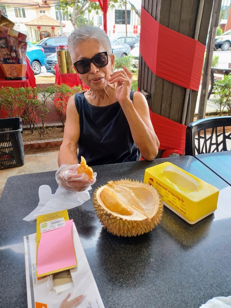 Zee picked us up and we headed off for, you guessed it – more food. This time Chicken Rice, followed up with a short drive to the durian shop. Now, for those of you unfamiliar with this particularly Malaysian delicacy, first and foremost, it is an acquired taste. I have not acquired it, but those who do, go crazy about it – as does Val. Unfortunately for her – or fortunately, depending on several factors – Zee is also not so partial to them either, so Val was able to enjoy a whole durian to herself. Just to put it into perspective, they have been described as garlic-flavoured custard with a hint of sewage. They do smell!! And if you think I am biased in any way, you are not allowed to take them on public transport or into a hotel.