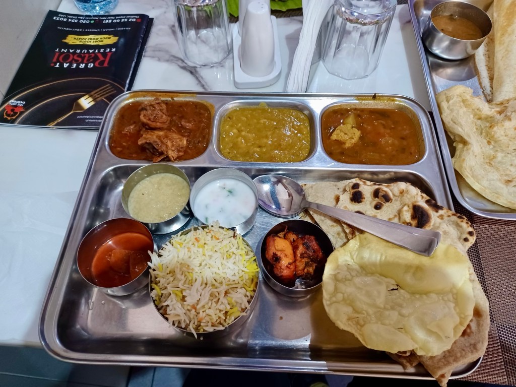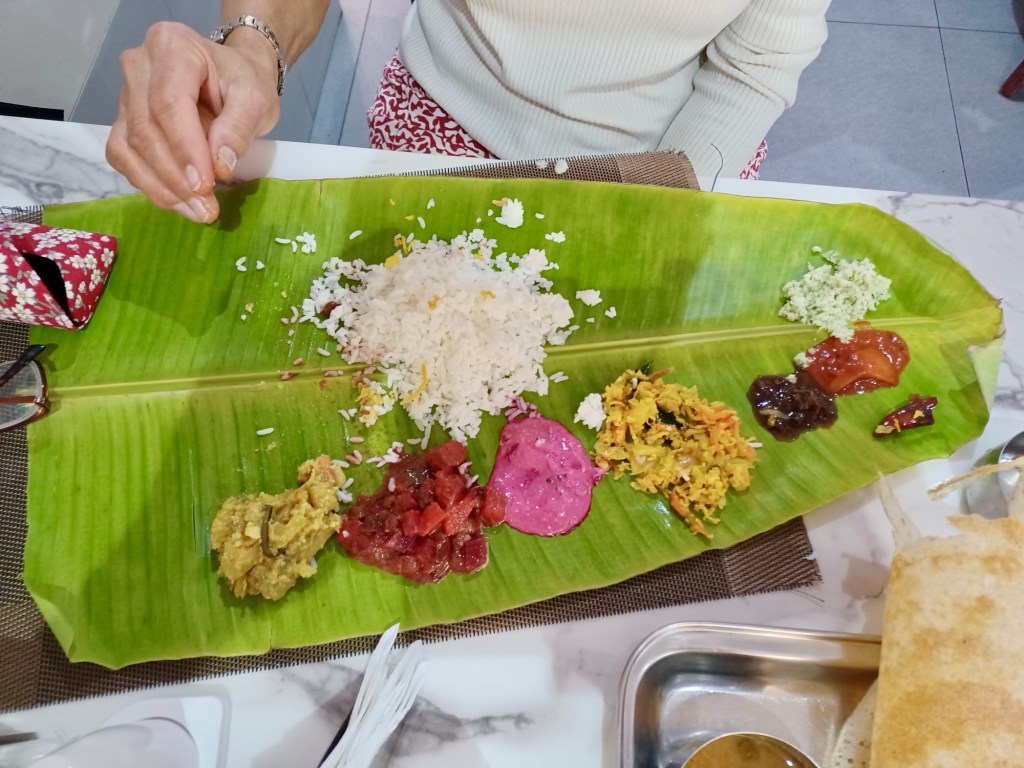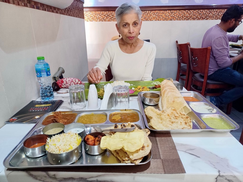 We had one more appointment for the day and that was lunch. Val particularly wanted a thali, which, for the uninitiated, is a bit like an Indian tapas and, in South India, is traditionally served on a banana leaf (saves washing up!). It is effectively a selection of different types of dishes, mostly curries, with a number of pickles, chutneys and other sauces, eg raita or yogurt. Easiest to look at the phots below. By way of contrast, I chose a North India thali. All delicious!!