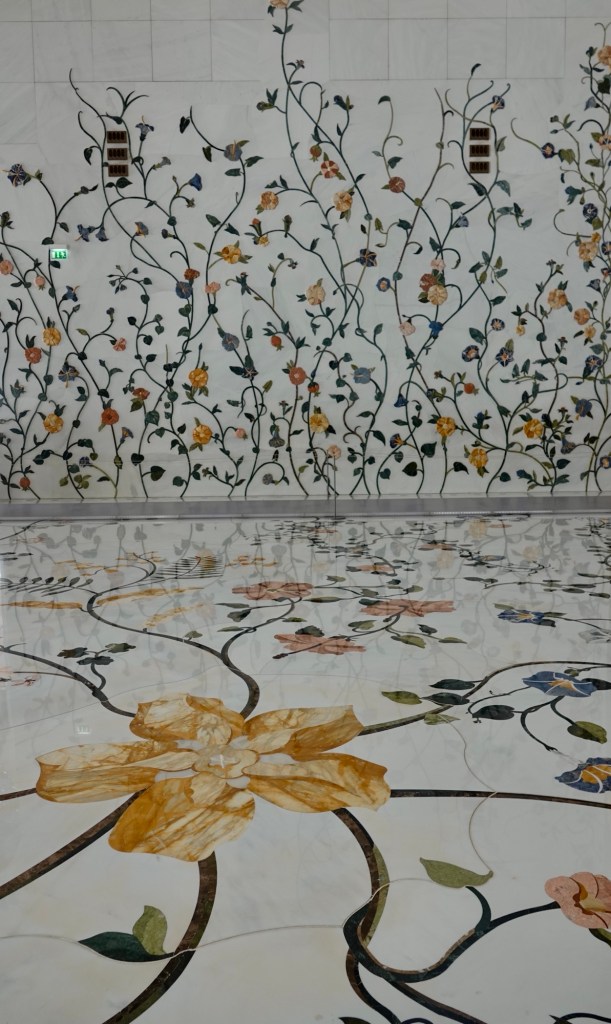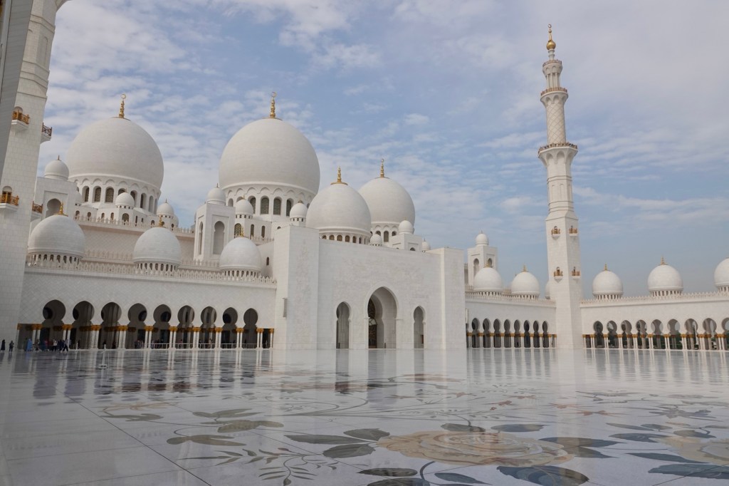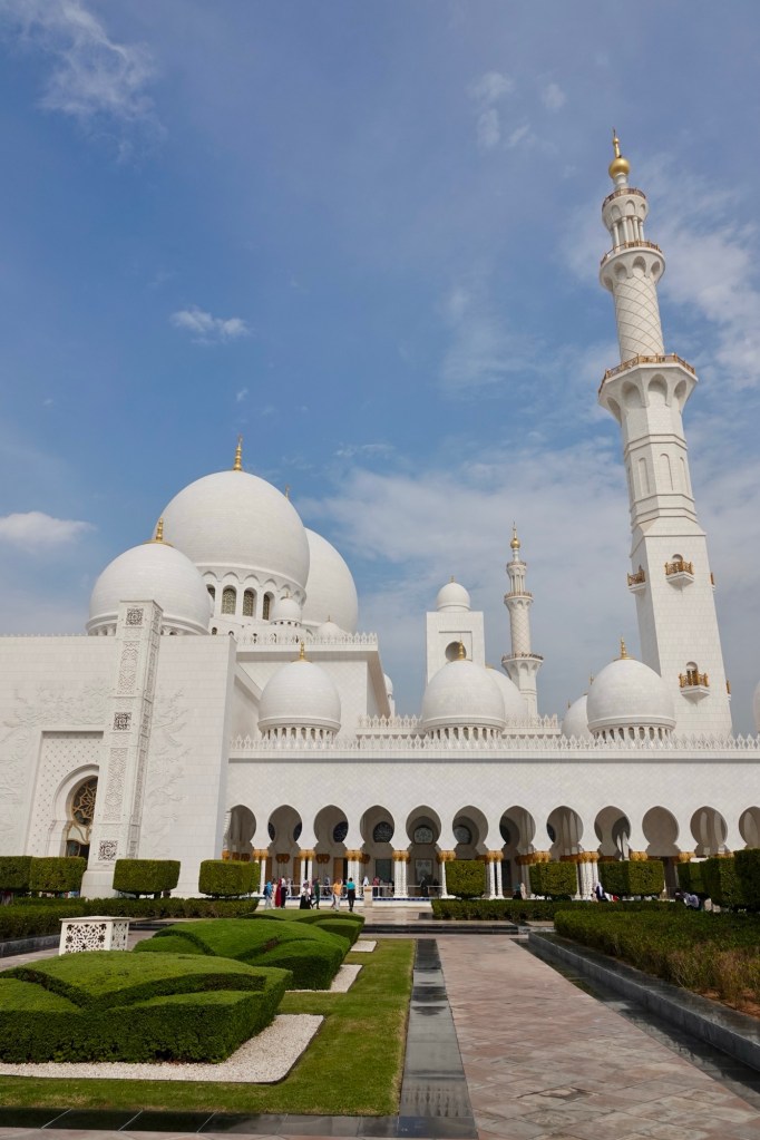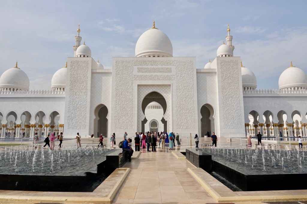 We had an early start today, not planned as such, just one of those things, which meant we were up and breakfasted and on our way to the Sheikh Zayed Grand Mosque by just past 10am. It is certainly a stunning building, as you might expect, though the entrance, rather surprisingly, is from another building where you descend to the basement, walk through a shopping mall past Burger King and perfume shops to the far end where you register. You then walk all the way back where, thankfully, there are buggies to whisk you underneath the gardens of the mosque and off to the lift that takes you up into the sunlight and the outside of the mosque. I have heard of ‘exit through the gift shop’, but this was a new one on me.