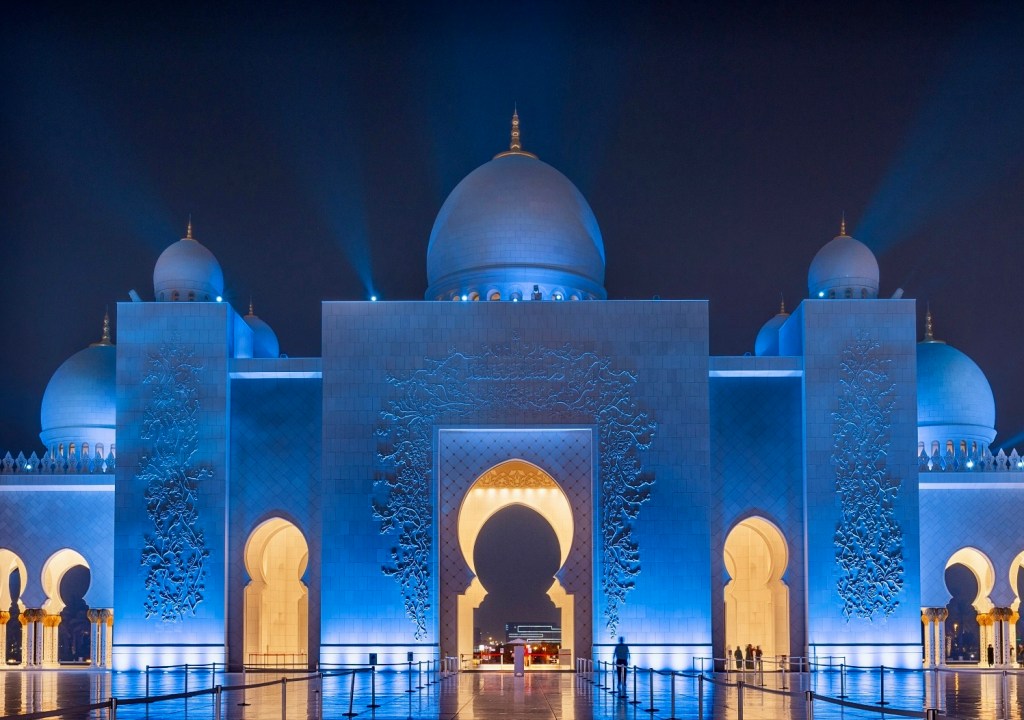 Soft undulating clouds of a bluish color are projected onto the mosque’s white marble external walls, including the façade and domes. Each day appears slightly different from the next as the lighting cycle commences with darker clouds when the month is in its early stages, and the moon is a small crescent. As the moon progresses through its cycle and becomes a full moon, the lighting effect becomes more brilliant.”