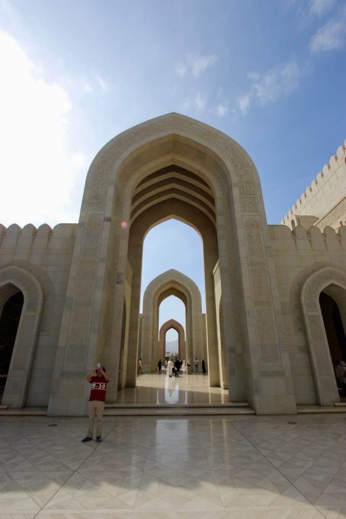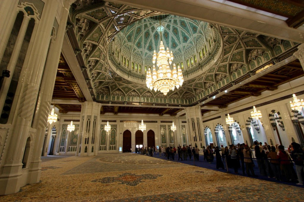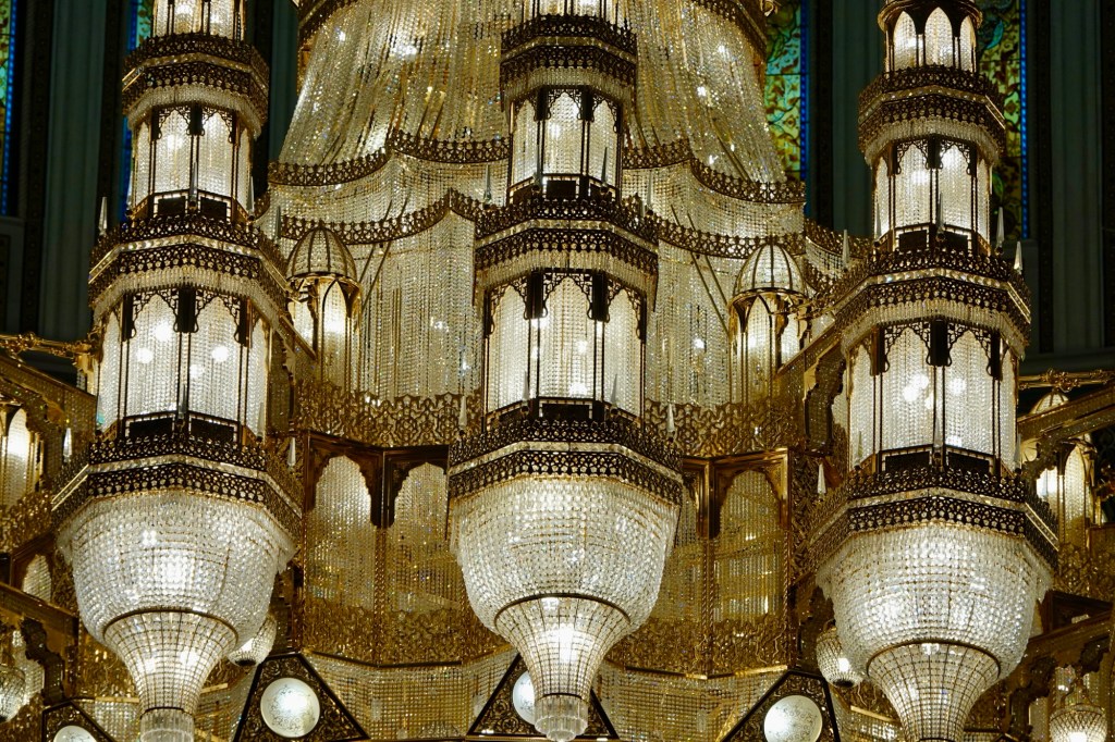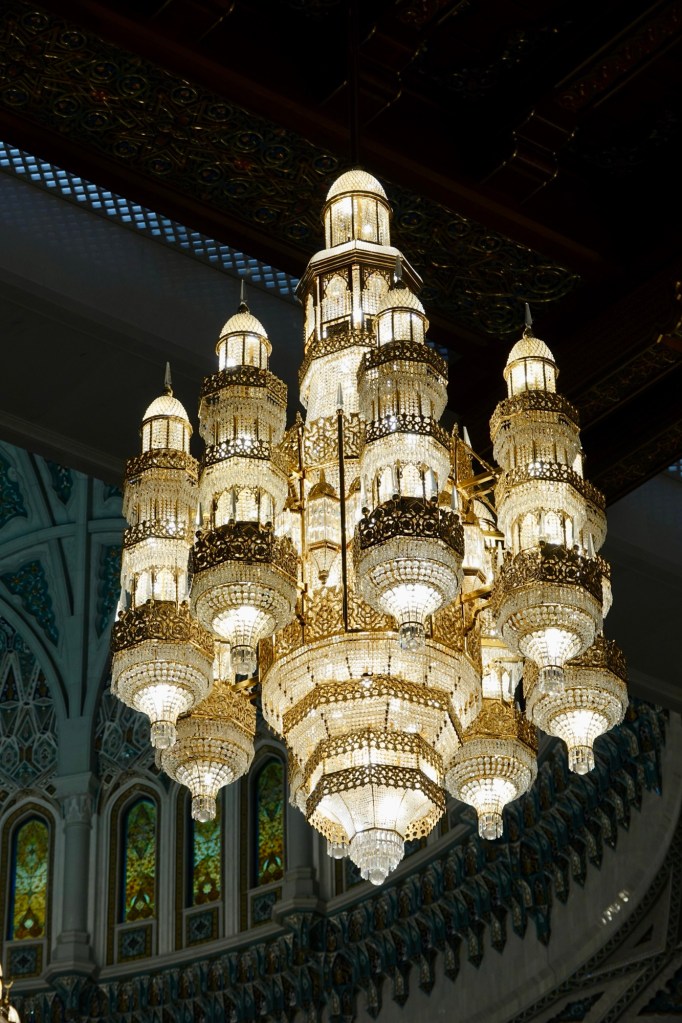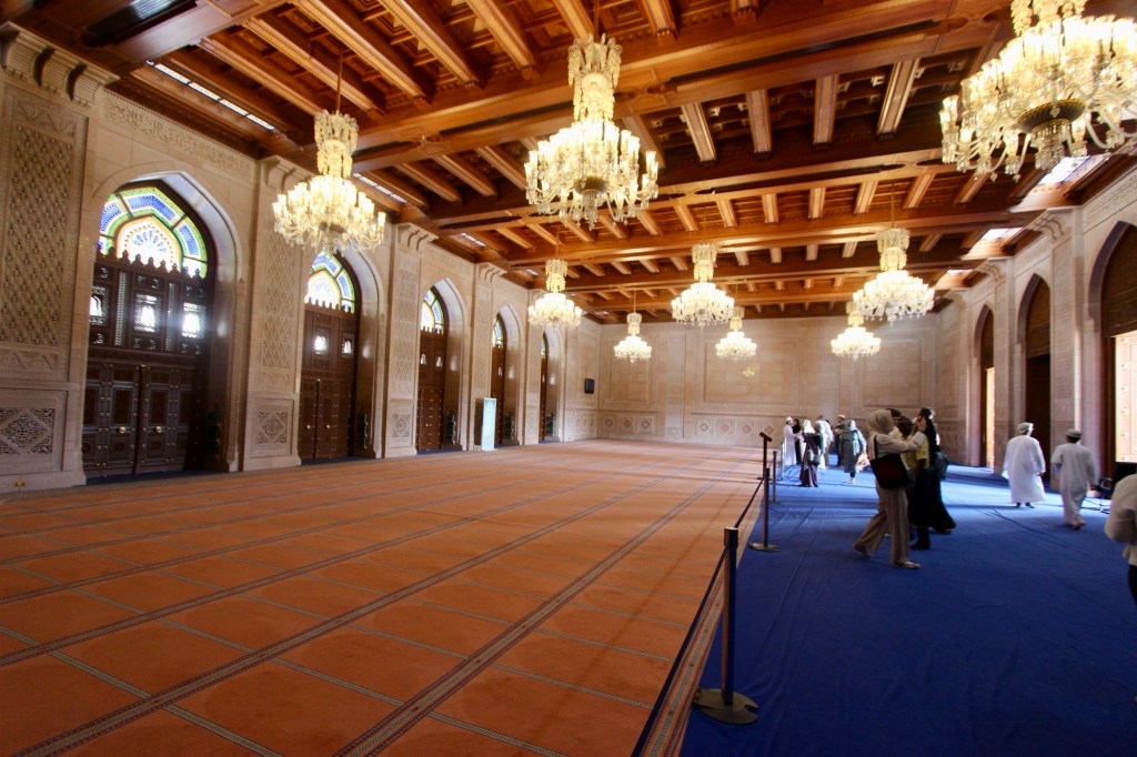 Our original plan for Monday had been to visit the Sultan Qaboos Grand Mosque earlyish and then head for the town/city of Nizwa (of which more soon). However, for some reason (of which more soon), Val’s mobility was very poor, so we set off a bit late. We made it OK to the mosque and popped Val into the wheelchair and with Ahmed driving, set off to explore the Grand Mosque.