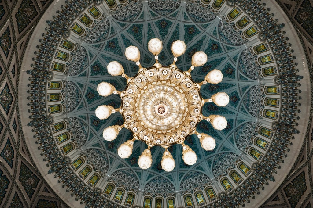 Now then, the Mosque. It was decided in 1992 (by Sultan Qaboos) that the country should have a Grand Mosque and, after 300,000 tonnes of Indian Sandstone had been imported, it was inaugurated in May, 2001. It can handle 6,500 (male) worshippers in the main musalla or prayer hall, though this can swell to 20,000 once the courtyards and passageways are used. The ladies’ musalla can accommodate 750 worshippers.