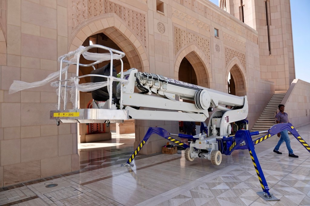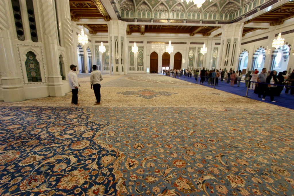 Two features particularly stand out. One is the carpet. It contains, 1,700,000,000 knots, weighs 21 tonnes and took 600 weavers four years to produce (in situ). It used to be the largest single-piece carpet in the world, covering 4,343 m2, but is now the second, after the Sheikh Zayed Grand Mosque in Abu Dhabi, the UAE, weighing in at 5,453 m2.