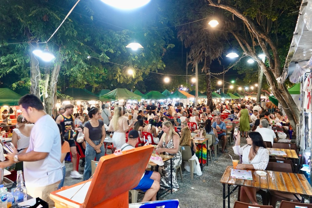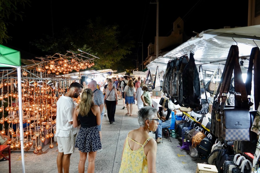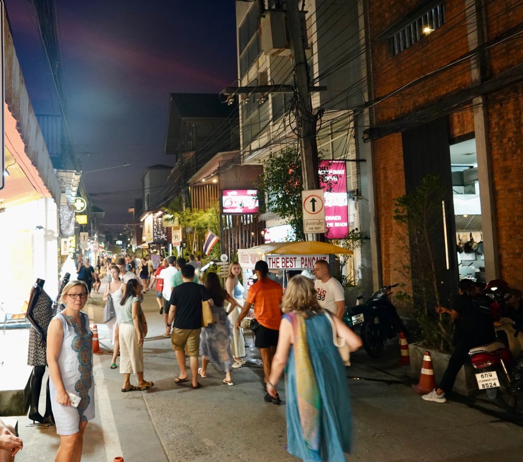 We have been out and about and not just to the hospital, dentist and pharmacy. Our hotel is in a town called Mae Nam and heading east you come to the next town, Bophut. To be honest, unless you read the signs you wouldn’t know where one ends and the other begins, but the latter, Bophut, (not sure how it is pronounced) has an area running along the beach called the Fisherman’s Village, though I suspect the actual fishermen sold up a long time ago. It is a nice walking street with some very fancy shops and restaurants and very busy, especially on a Monday, Wednesday and Friday when they have in addition a large Night Market with myriad stalls selling a wide variety of goods. Some photos…