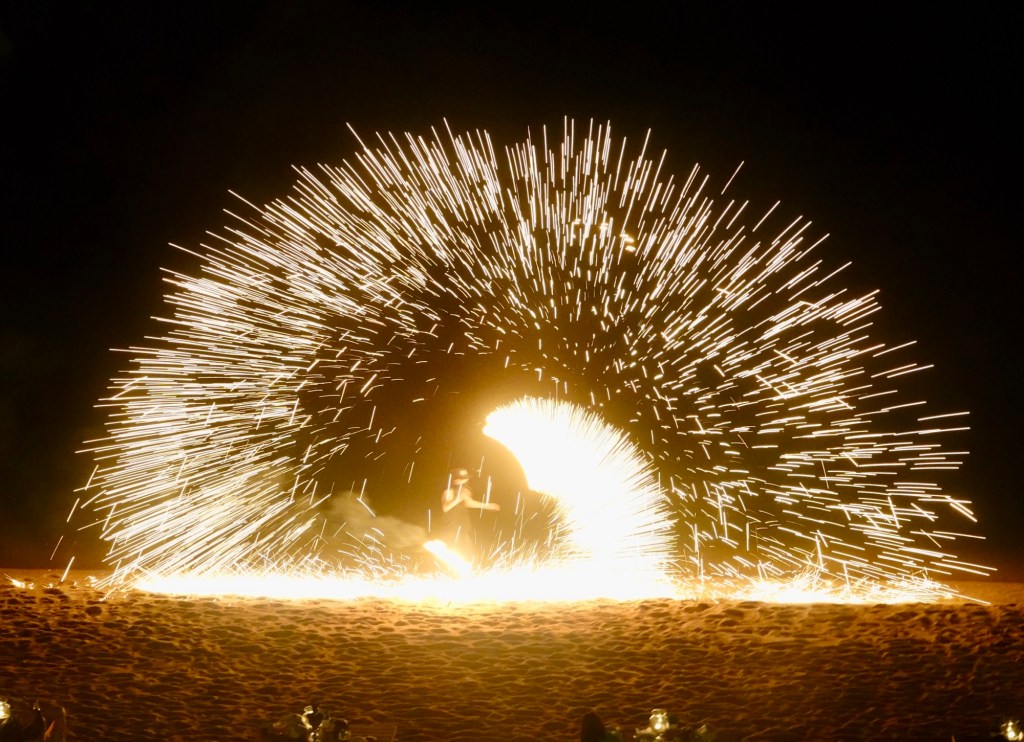 The troupe of fire dancers moving among the crowd getting tips – the proximity of the flames possibly helping the cause.