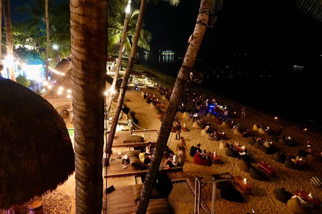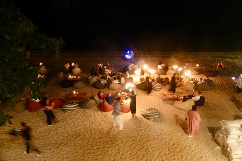 Lots of punters enjoying the comfy chairs on the beach watching the display of fire dancers.