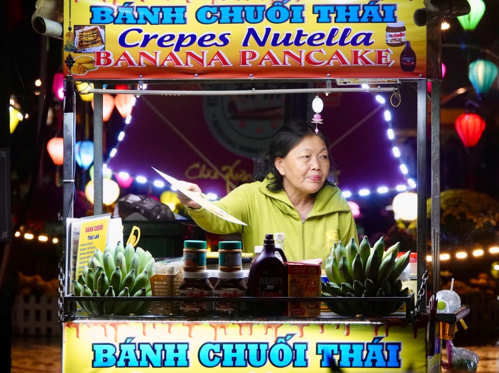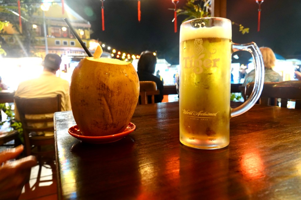 We arranged with our trusty Grab driver, Duoc, to pick us up at 6pm, take us to a supermarket en route for some essential supplies (supermarket is being a bit generous, but they had what we wanted) and drop us off near the market, which is on a small island on the other side of the river next to the old town.