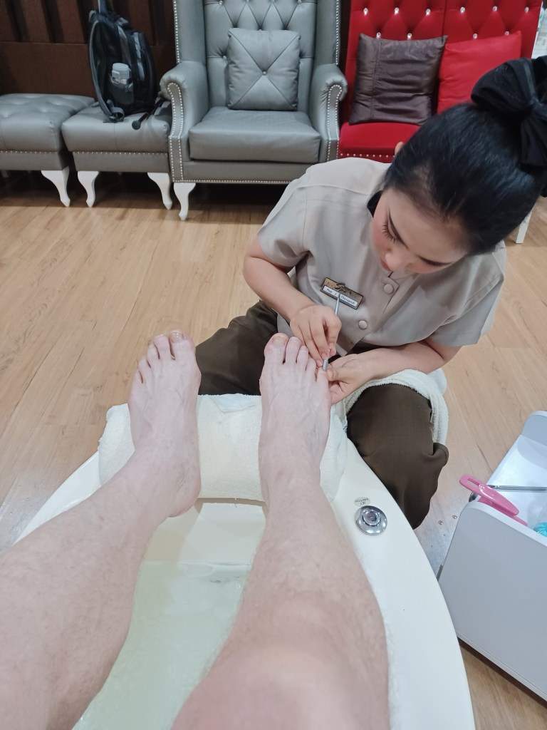 We had decided to have a treat of a rather more up-market spa day, so we headed off quite early for Ao Nang. We were then treated to various treatments, slightly varied as Val could not do all of them. So I headed for the steam room for 30 minutes, followed by a body scrub, oil massage, head massage and a collagen facial!! We even had a manicure and pedicure, which in my case were something of a labour and I have vowed to try and keep my feet in better shape in future..