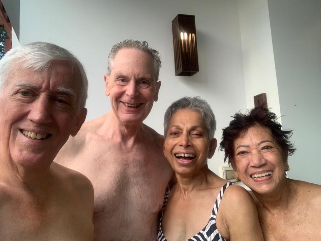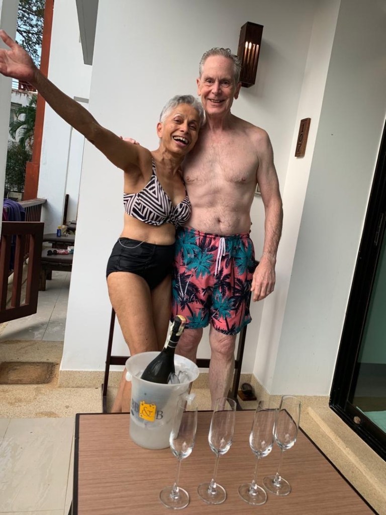 Now, as mentioned in the post before this one, we had another treat in store as our very great friends, Ad and Babes, flew up from Kuala Lumpur to Krabi on Monday, 20th to spend a few days with us. It was so lovely of them and, as ever, great fun, including some fizz after a swim to celebrate my three score and ten..